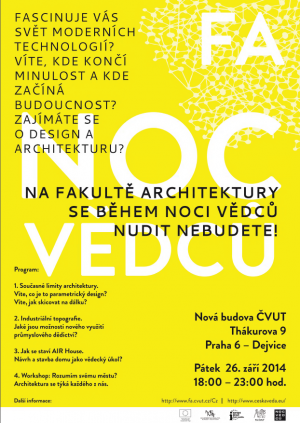 Fakulta architektury ČVUT se letos poprvé zapojuje do Noci vědců, která se uskuteční v pátek 26. září 2014. Program v nové budově Fakulty architektury (Thákurova 9, Praha 6) bude probíhat od 18 do 23 hodin.